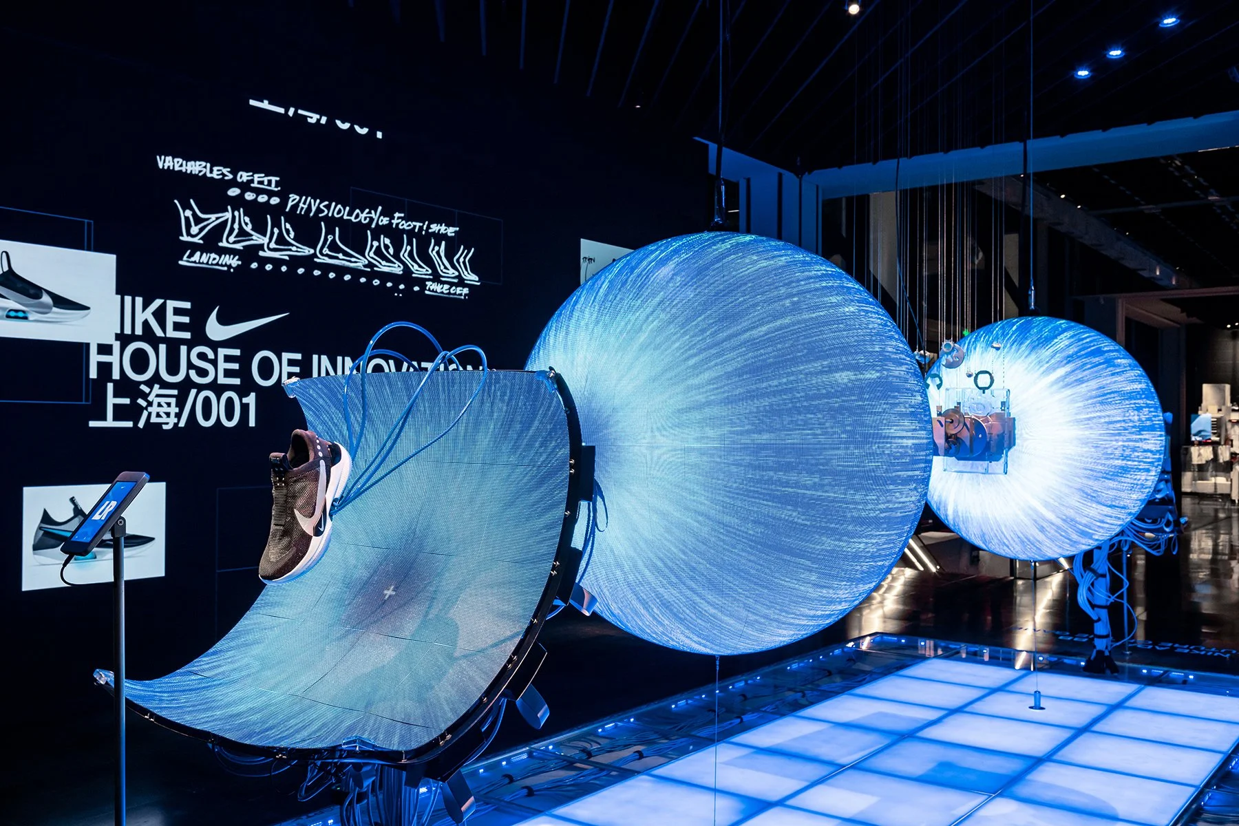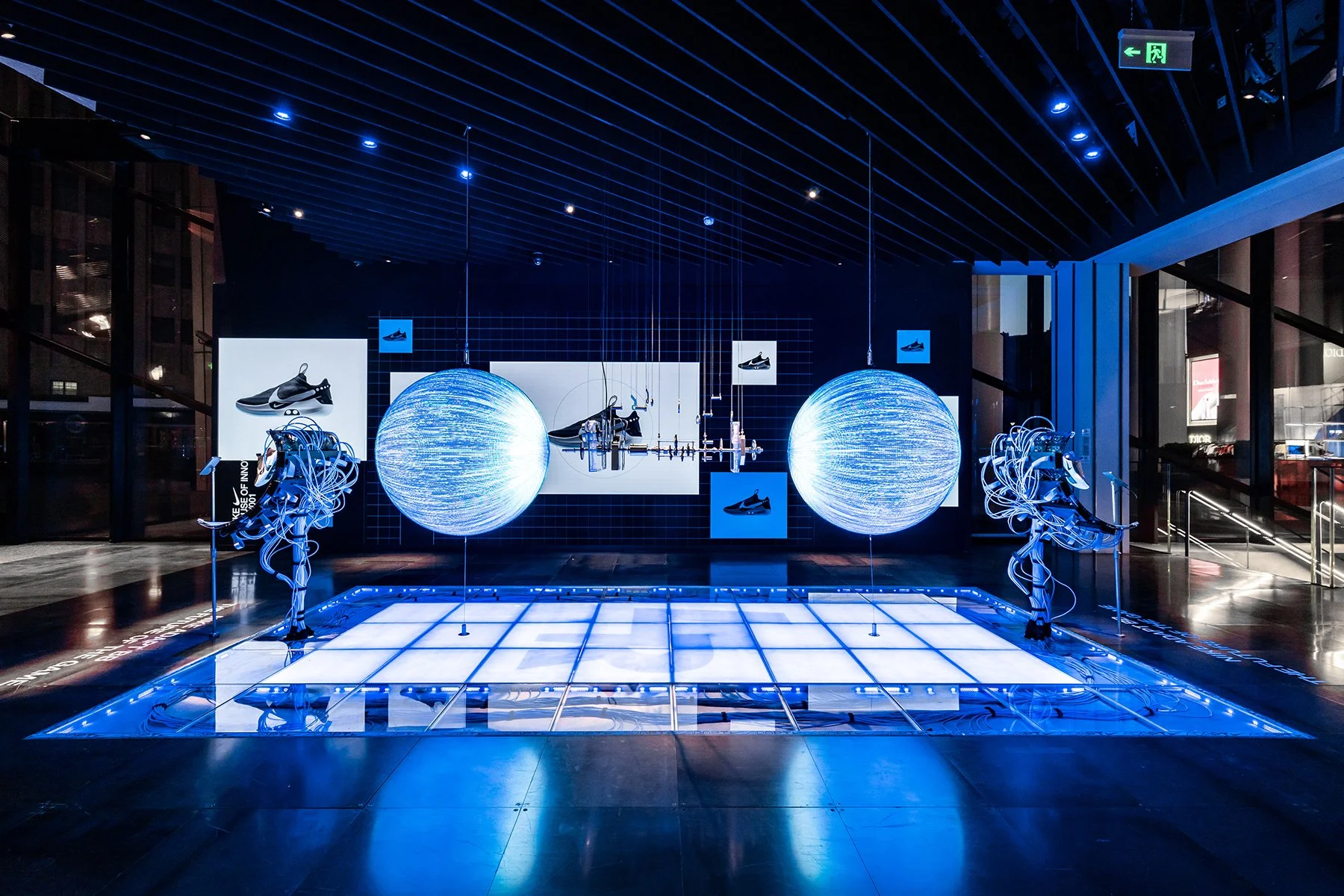 What was once a movie prop and every sneakerheads wildest fantasy has now become reality with the Nike Adapt. Not only was Nike able to integrate the powerlacing concept as a performance feature, the shoe is also equipped with innovative features such as chargers, diodes and mobile connection. Taking inspiration of the iconic diodes and zooming engine the entrance display consisted out of two opposing P3 LED spheres. In between these spheres a kinetic installation represents the internal workings of the driving engine. In the front a soft LED panel including an iPhone, connected to a Nike Adapt, was used to give the customers hands-on demo. All the parts were connected to each other to create a synchronize symphony of light movement and sound.